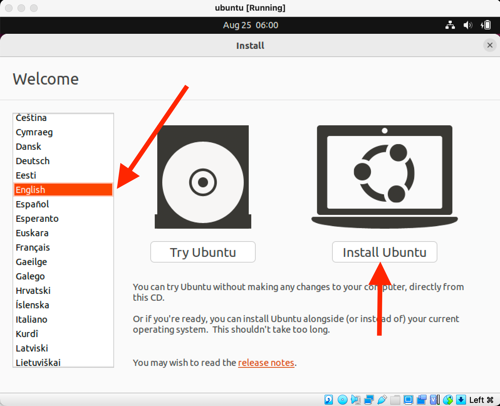 - Дожидаемся экрана установки. Выбираем язык, на котором будет удобно работать, и нажимаем Install Ubuntu (установить Ubuntu).