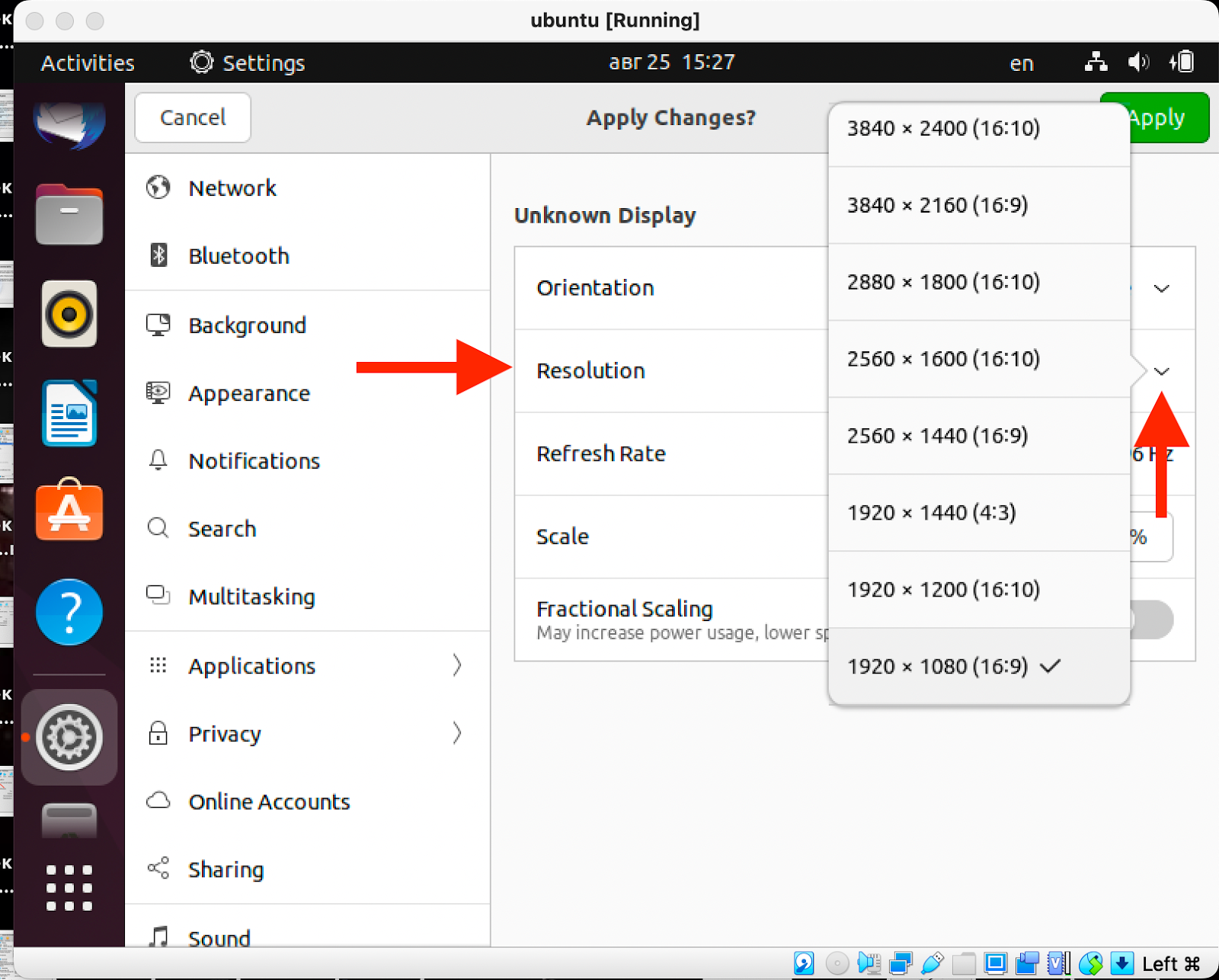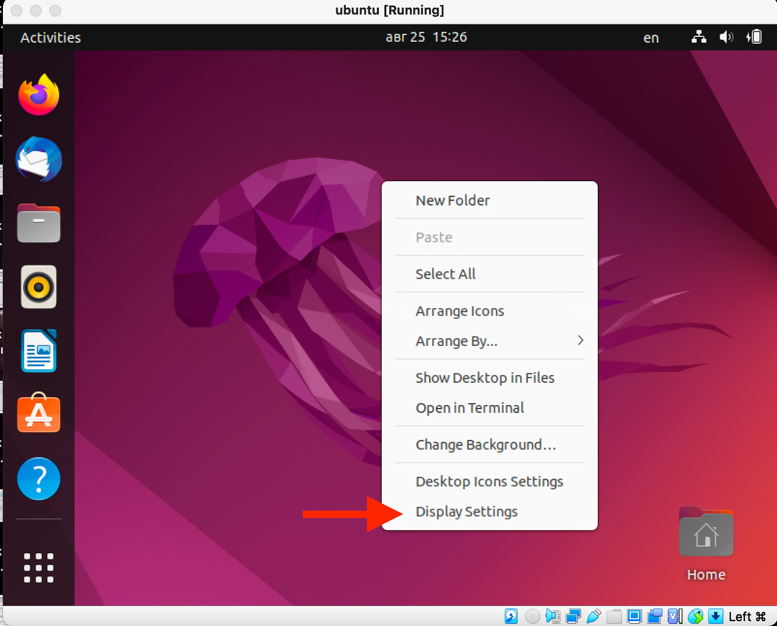 Настраиваем комфортное для работы разрешение: нажимаем правой кнопкой на рабочий стол и заходим в настройки дисплея.