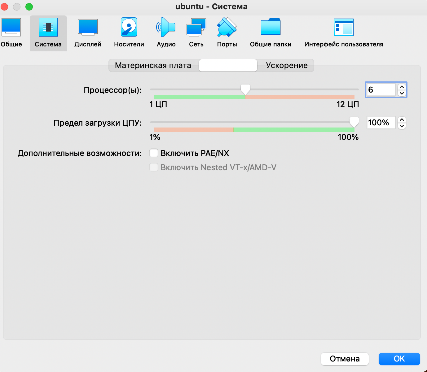 - Для увеличения производительности мы увеличиваем количество ядер в настройках «Система -> процессор».