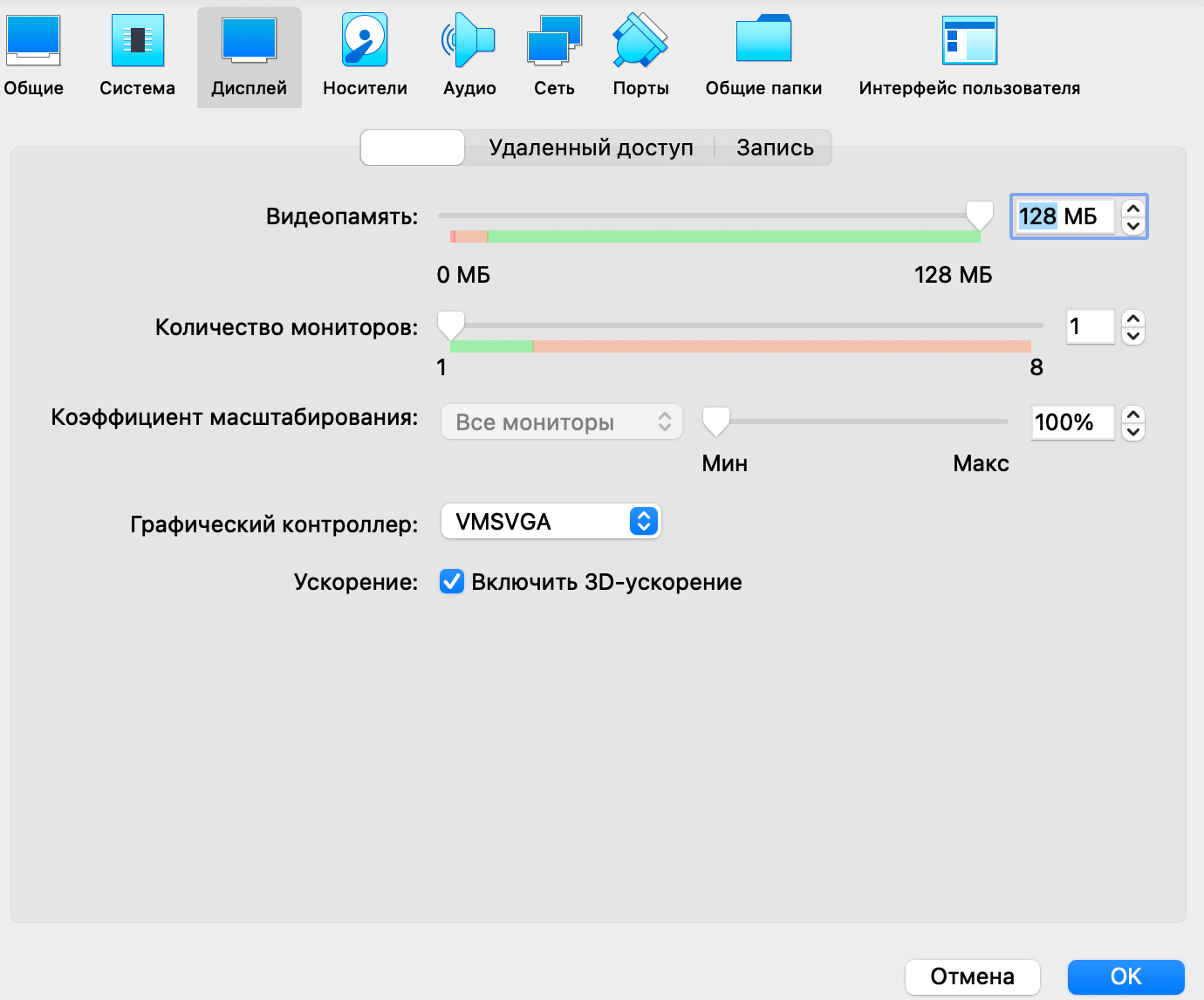 - Также увеличиваем количество видеопамяти до 128 Мб.