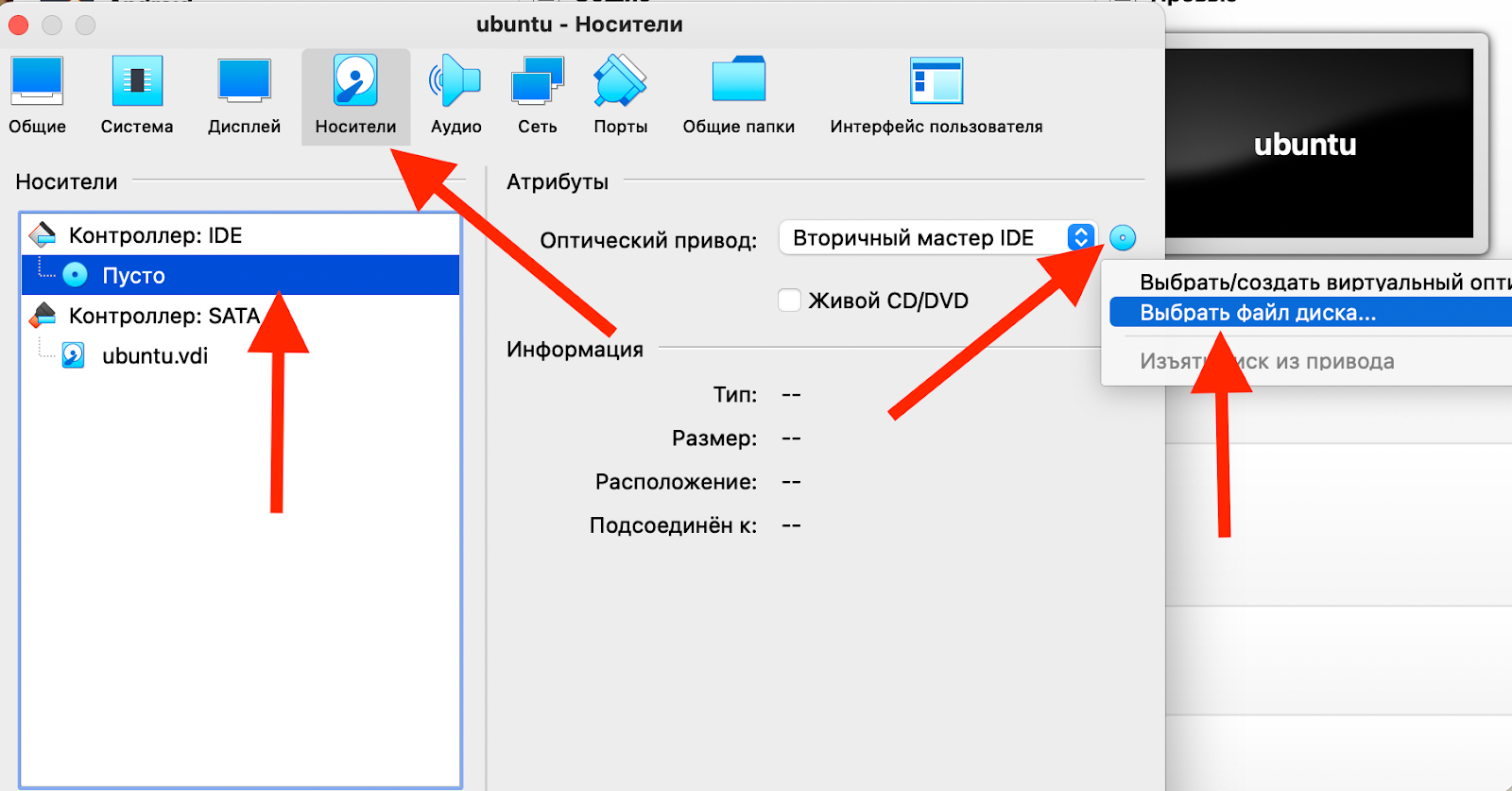 - Затем переходим в Носители -> Контроллер IDE -> Значок Диск Пусто -> На значок диска -> Выбрать файл с диска.