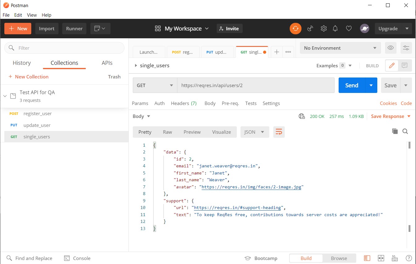 - Указываем ссылку на API и после отправления смотрим на полученный результат, соответствующий ожидаемому.