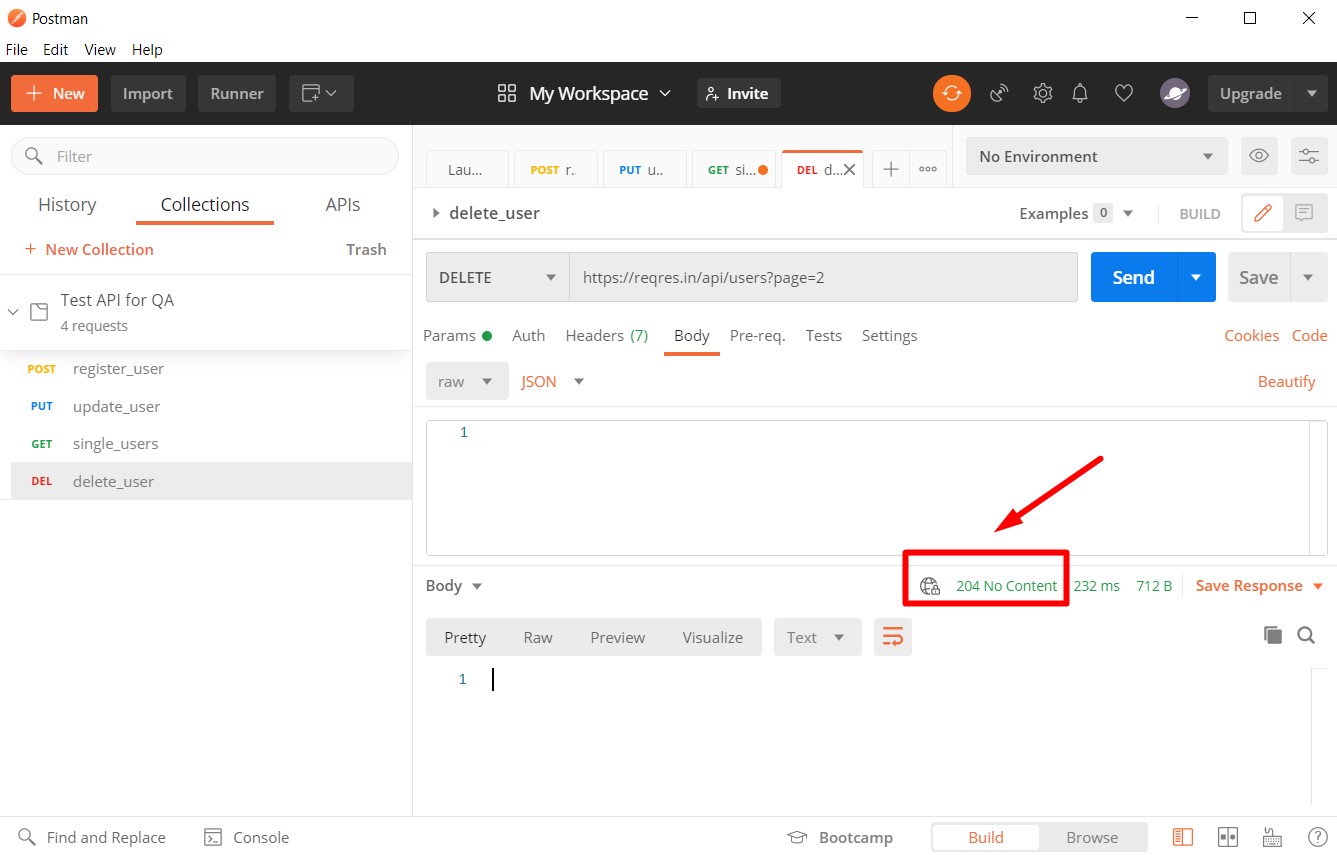 Получаем от сервера в ответ статус 204 No Content, информирующий об успешности запроса, но без содержимого, то есть данные были успешно удалены.