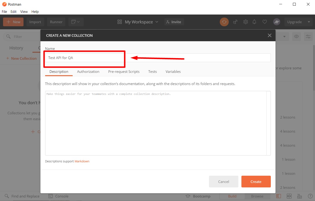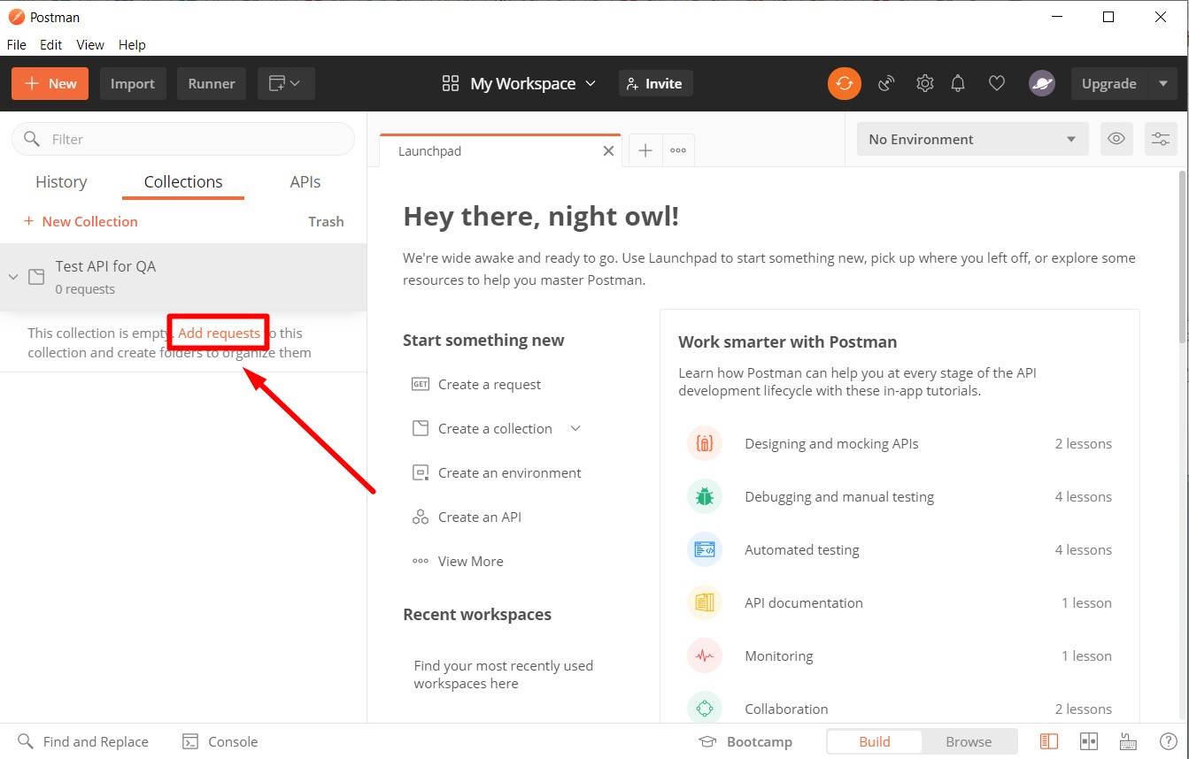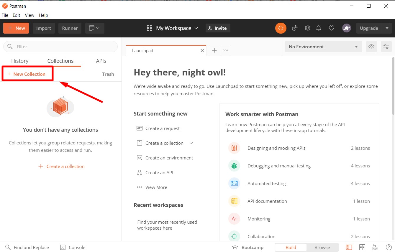 - После запуска в Postman создай папку с коллекцией запросов. Для этого нужно во вкладке Collections нажать на New Collection.