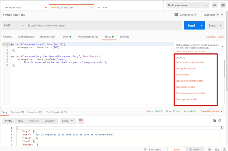 Это те самые встроенные автотесты, которые помогут в написании тестов, прогоняемых в раннере. Сниппеты все разные и можно выбрать те, которые обеспечат максимальное покрытие запроса тестами, кастомизировав их под свой кейс. Например: