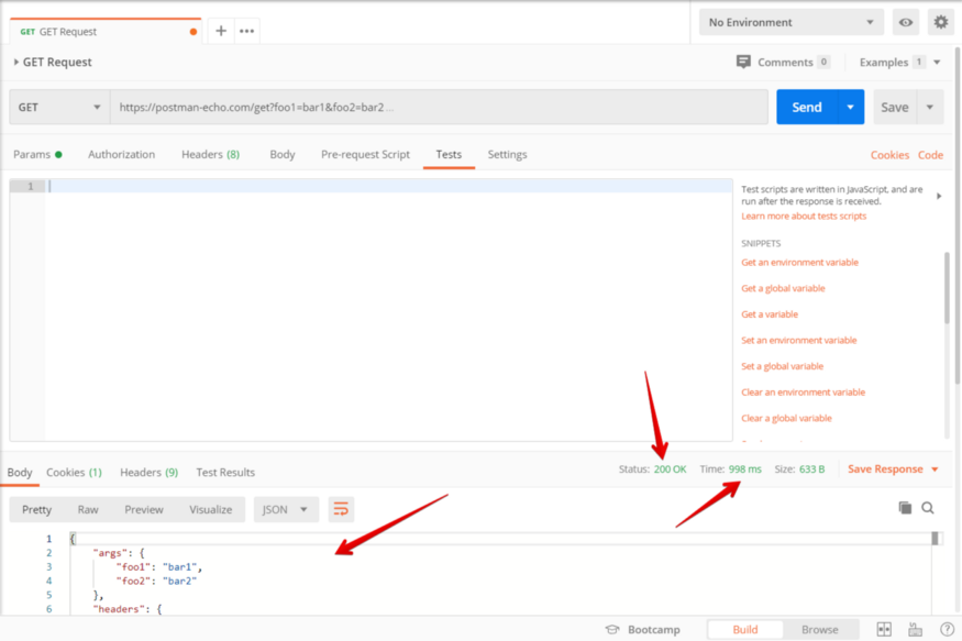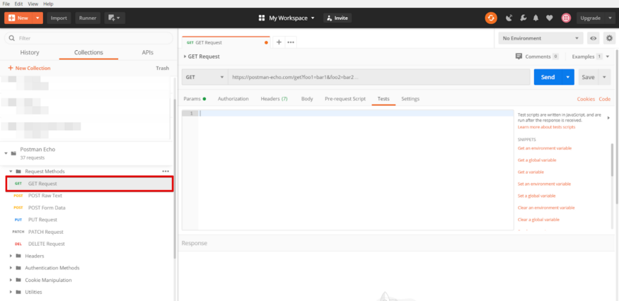 Рассмотрим сниппеты на примере запроса в папке “Request methods”, называемого “Get request”.