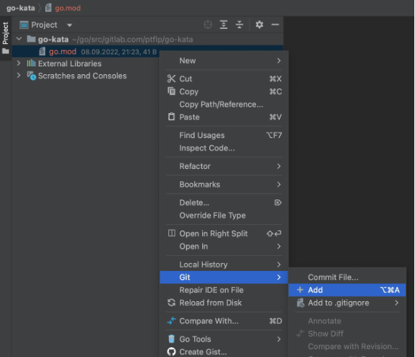 7. Должен появиться файл go.mod, добавим его в индекс гита.