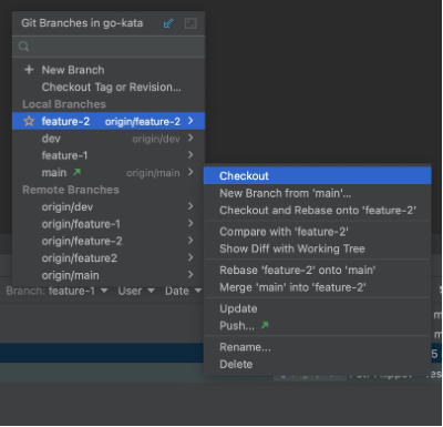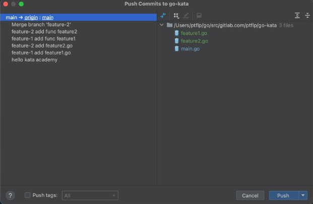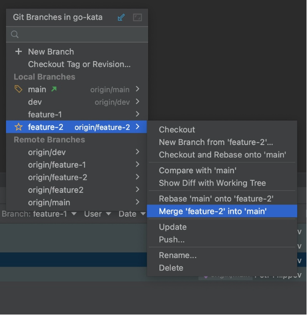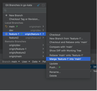 1. Перейдем в ветку main и смержим обе ветки — feature-1 и feature-2 — в main.