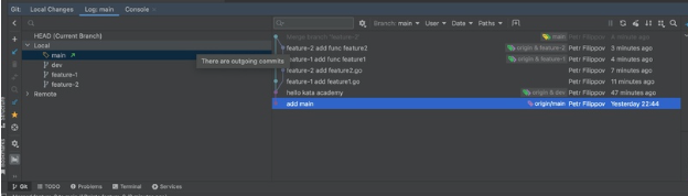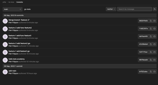 3. Посмотрим историю коммитов. Она будет выглядеть запутанной, так как два функционала разрабатывались параллельно.