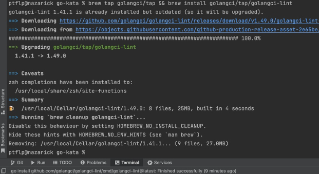При наличии программа тоже должна отобразить путь до бинарника.Если отсутствует golangci-lint, воспользуйся этой инструкцией для установки.