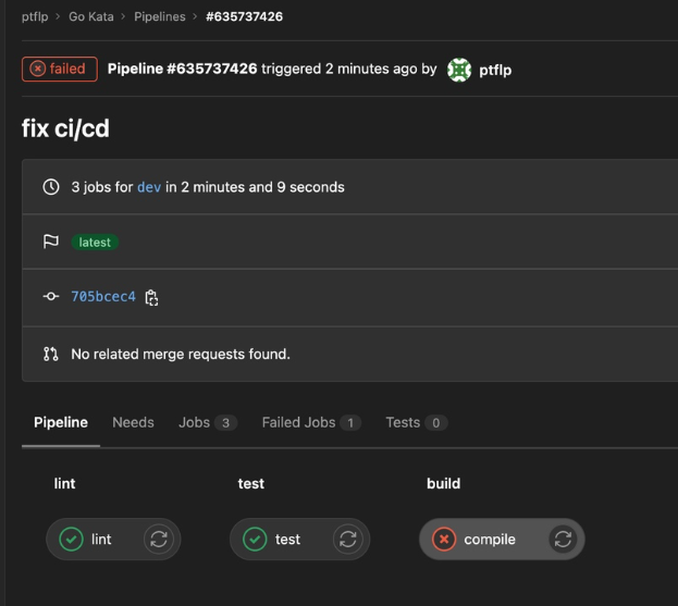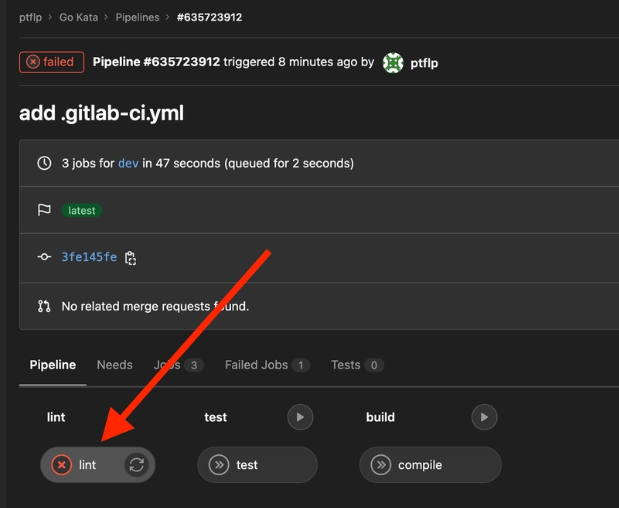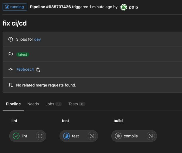 3. После фикса снова пройдем в pipelines. Здесь можно увидеть, что на стадии lint ошибок не возникает.