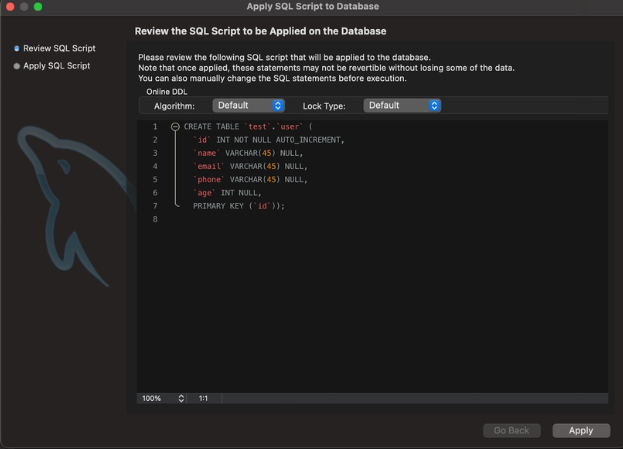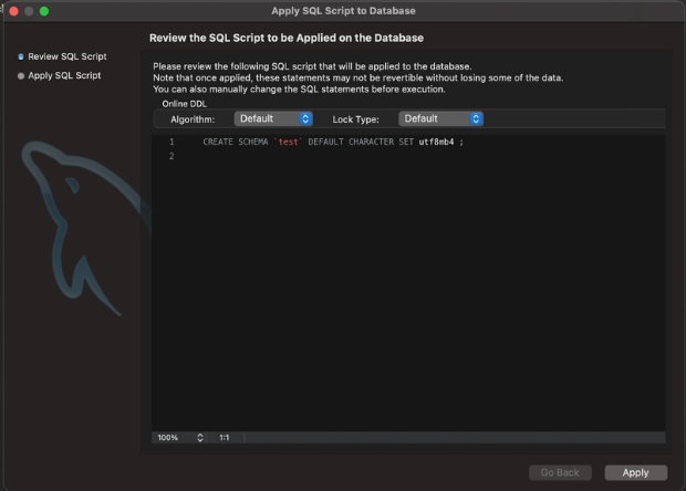 Появится окно со сгенерированным SQL-запросом на создание схемы (базы), здесь тоже нажимаем Apply.