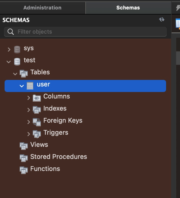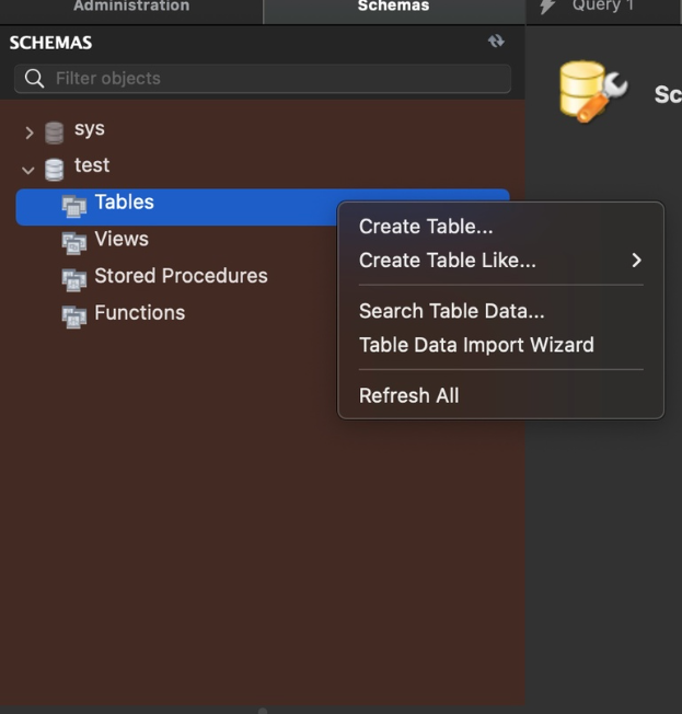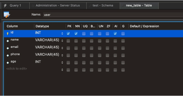 4. Создадим таблицу user: нажимаем правой кнопкой мыши на tables -> create table.