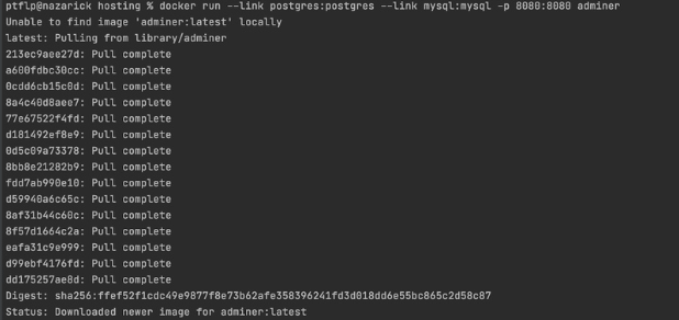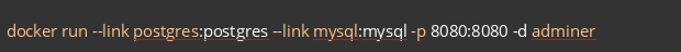 Далее запустим adminer.Команда link отвечает за связку контейнеров в одну сеть, является deprecated (устаревшей командой, в новых версиях докера эта команда будет отсутствовать), использование в рабочих проектах не рекомендуется.