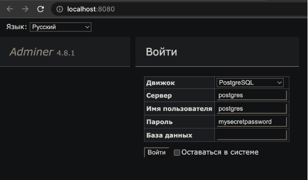2. Пропишем параметры, как на изображении. Так как к docker-контейнеру можно обращаться по имени, вместо ip address в поле «Сервер» впишем