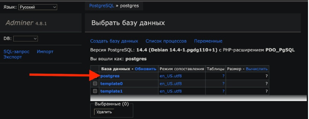3. Отобразится список баз данных (бд). Перейдем в бд postgres.