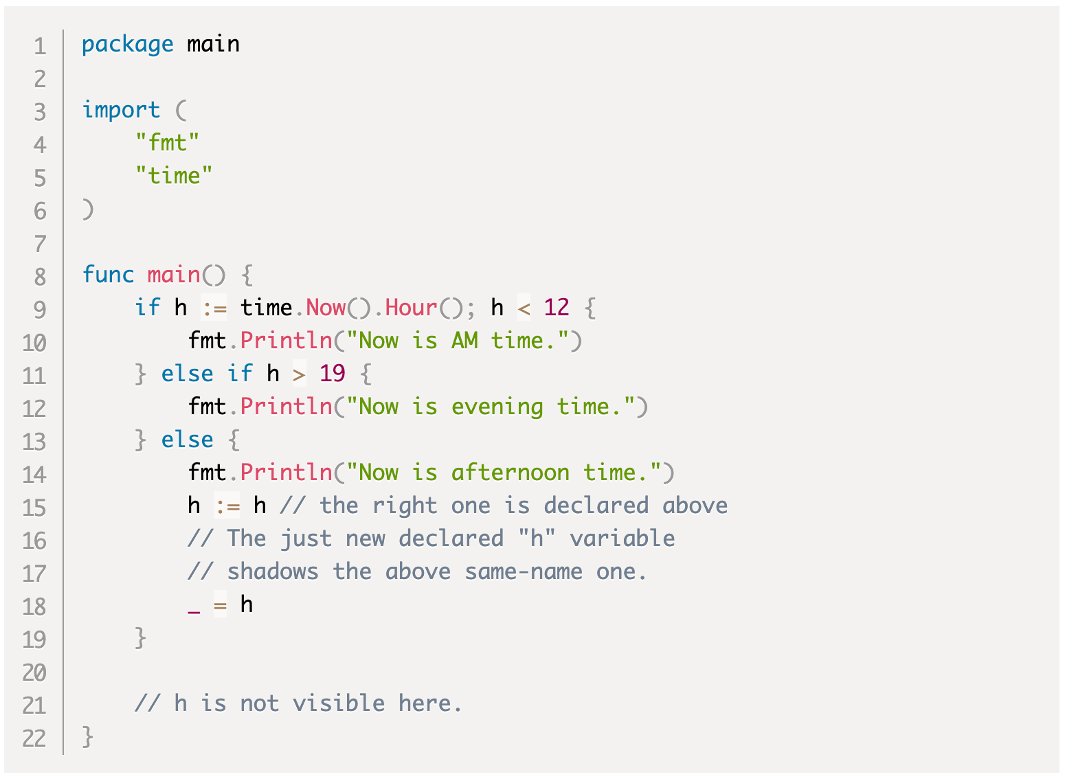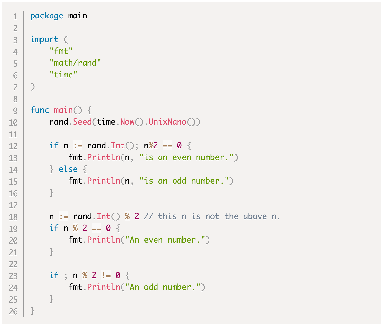 Часть InitSimpleStatement также необязательна. Это должно быть простое утверждение, если оно присутствует. Если оно отсутствует, мы можем рассматривать его как пустой оператор — один из видов простых операторов. На практике InitSimpleStatement часто используется короткое объявление переменной или чистое присваивание. A Condition должно быть выражением, результатом которого является логическое значение. Порция Condition может быть заключена в пару () или нет, но не может быть заключена вместе с InitSimpleStatement порцией.