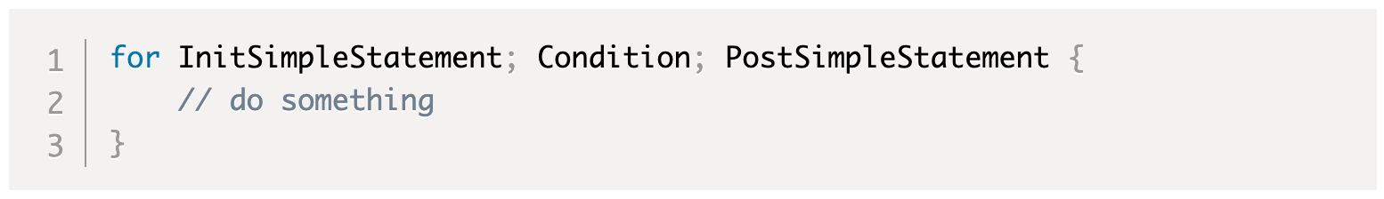 for является ключевым словом. Части InitSimpleStatement и PostSimpleStatement должны быть простыми операторами, и PostSimpleStatement часть не должна быть коротким объявлением переменной. Condition должно быть выражением, результатом которого является логическое значение. Все три части являются необязательными.