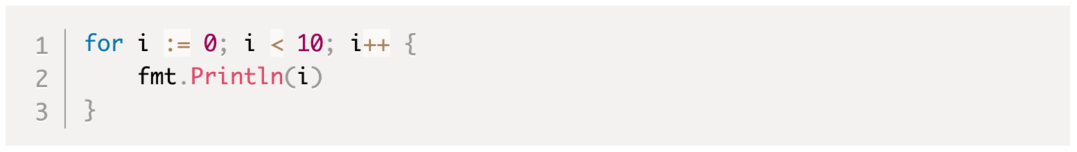 В отличие от многих других языков программирования, только что упомянутые три части, следующие за for ключевым словом, не могут быть заключены в пару ().