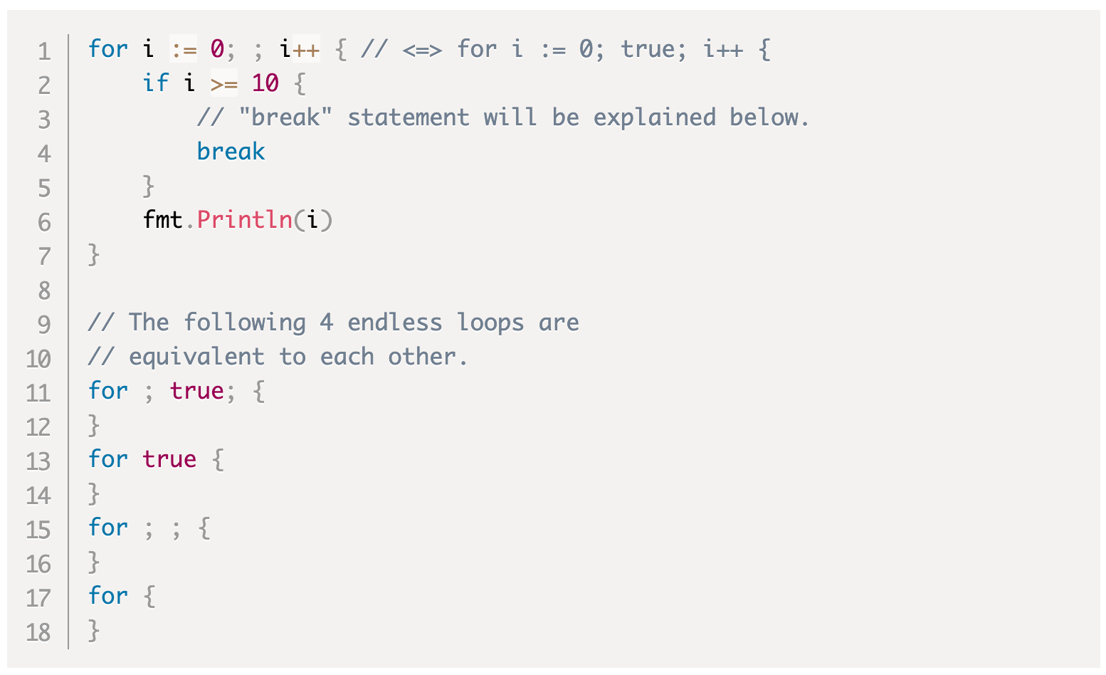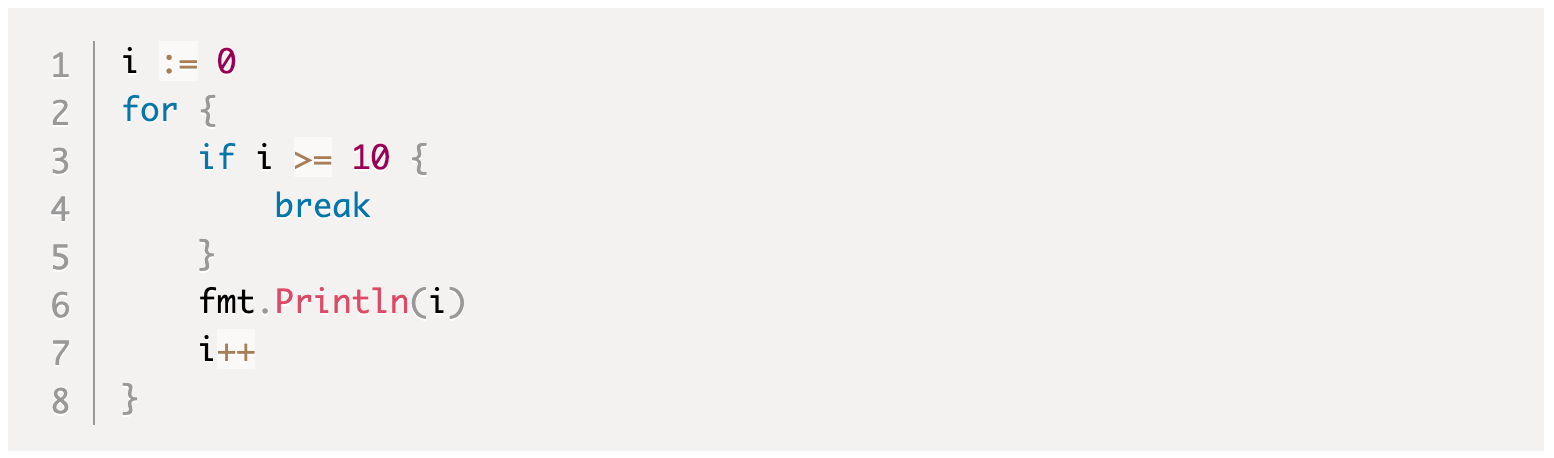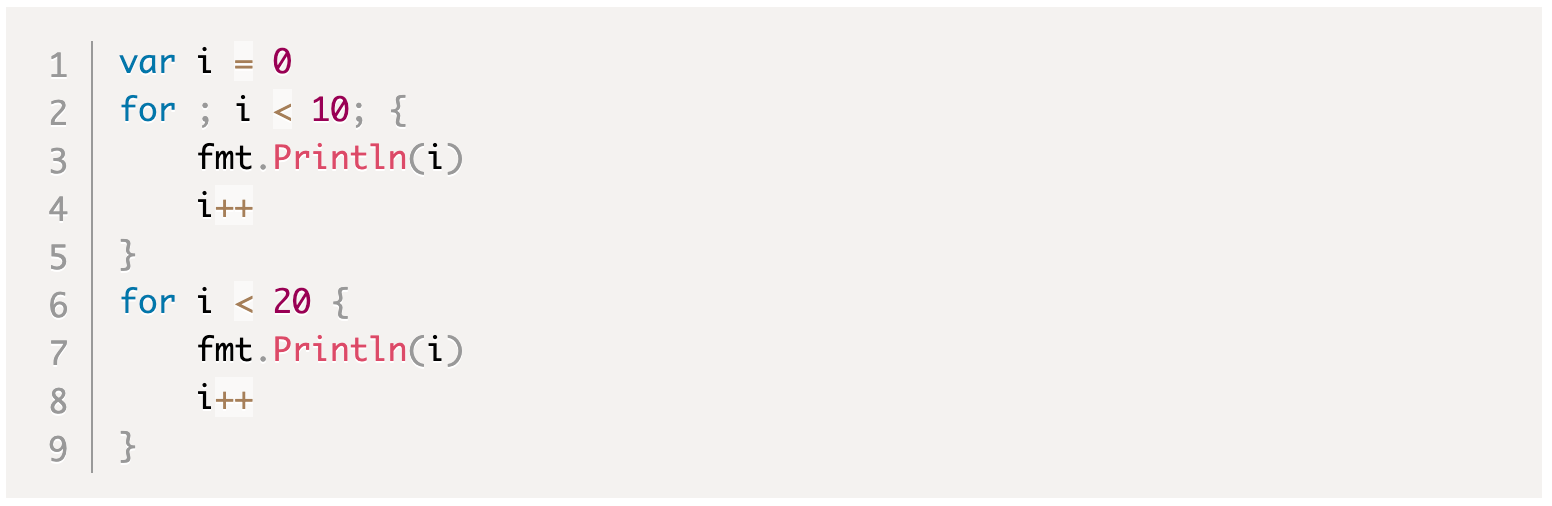 Если обе части InitSimpleStatement и PostSimpleStatement отсутствуют (просто рассматривайте их как пустые операторы), две точки с запятой рядом с ними можно опустить. Форма называется for формой цикла только с условием. Это то же самое, что while цикл в других языках.