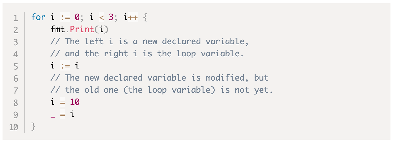 Если InitSimpleStatement в блоке for является коротким оператором объявления переменных, то объявленные переменные будут рассматриваться как объявленные в верхнем вложенном блоке неявного кода for блока. Например, следующий фрагмент кода печатается 012 вместо 0.