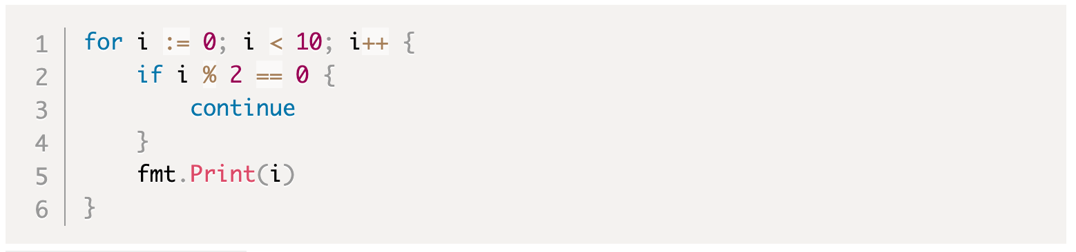 Оператор continue может быть использован для завершения текущего шага цикла заранее (PostSimpleStatement все равно будет выполнен), если for блок потока управления циклом является самым внутренним блоком потока управления циклом, содержащим continue оператор. Например, следующий фрагмент кода напечатает 13579.