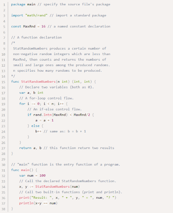 Строка 1 указывает имя пакета текущего исходного файла. Функция main входа должна быть объявлена в пакете, который также называется main. Строка 3 импортирует пакет, math/rand стандартный пакет кода. Его импортное имя rand. Функция, Intn объявленная в этом стандартном пакете, вызывается в строке 21.