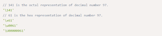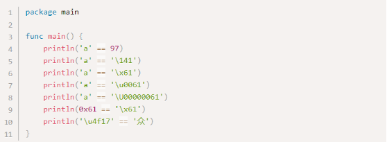 Следующие варианты литерала руны эквивалентны 'a' (значение символа Unicode равно a 97).