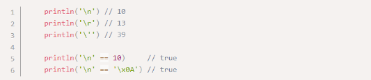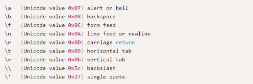 Если рунический литерал состоит из двух символов, не считая двух кавычек, первый из которых является символом \, а второй не является цифровым символом, x и u, U то два последовательных символа будут экранированы как один специальный символ. Возможные пары символов для экранирования представлены на картинке ниже.