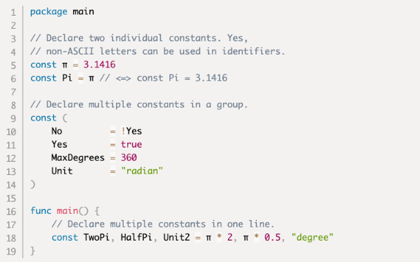 В приведенном выше примере имена констант π и Pi связаны с литералом 3.1416. Две именованные константы могут использоваться во многих местах кода. Без объявлений констант литерал заполнялся бы 3.1416 в этих местах. Если мы хотим изменить литерал на 3.14 более поздний, нужно изменить многие места. С помощью объявлений констант литерал 3.1416 появится только в одном объявлении константы, поэтому нужно изменить только одно место. Это основная цель объявлений констант.