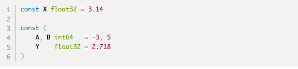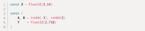 Мы можем объявлять типизированные константы, все типизированные константы именуются. В следующем примере все четыре объявленные константы являются типизированными значениями. Типы X и Y — float32, а типы A и B — int64.