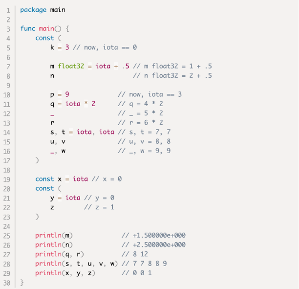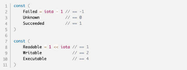 Приведенный выше пример просто демонстрирует правила функции iota генератора констант. Конечно, на практике мы должны использовать его более осмысленно. Например: