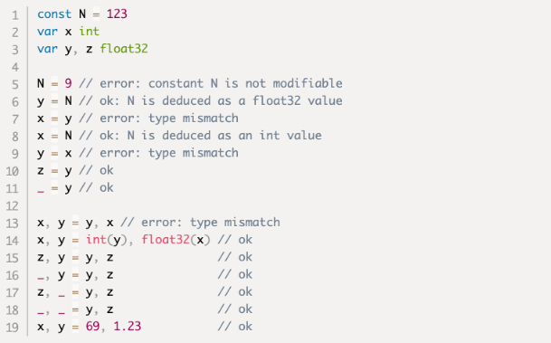 Пустые идентификаторы также могут появляться слева от назначений чистых значений в качестве целевых значений, и в этом случае это предполагает, что мы игнорируем целевые значения. Пустые идентификаторы нельзя использовать в качестве исходных значений в назначениях.