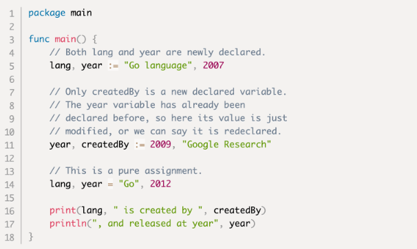 Обрати внимание, что по сравнению с чистыми присваиваниями существует ограничение на короткие объявления переменных. В коротком объявлении переменной все элементы слева от знака := должны быть чистыми идентификаторами. Это означает, что некоторые другие элементы, которые можно назначить представленныев других статьях, не могут отображаться слева от :=. Эти элементы включают квалифицированные идентификаторы, элементы контейнера, разыменования указателя и селекторы полей структуры. Чистые присваивания не имеют такого ограничения.