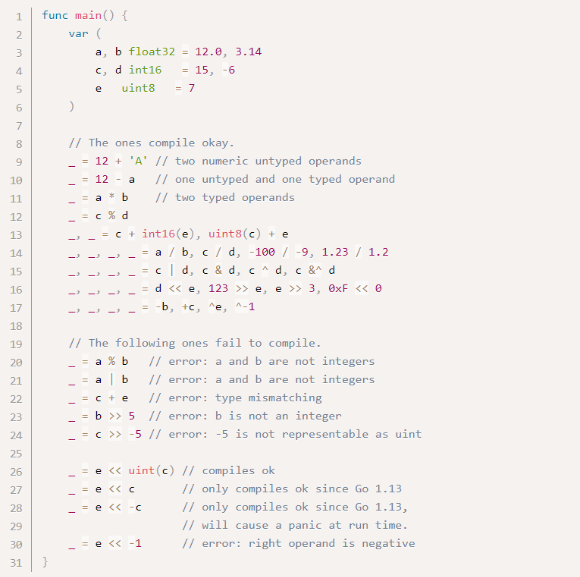 | << | побитовый сдвиг влево | Левый операнд должен быть целым числом, правый операнд также должен быть целым числом (если это константа, то оно должно быть неотрицательным), их типы не обязательно должны быть идентичными. Обрати внимание, что до Go 1.13 правый операнд должен быть целым числом без знака или целочисленной константой без знака, которая может быть представлена как uint значение.