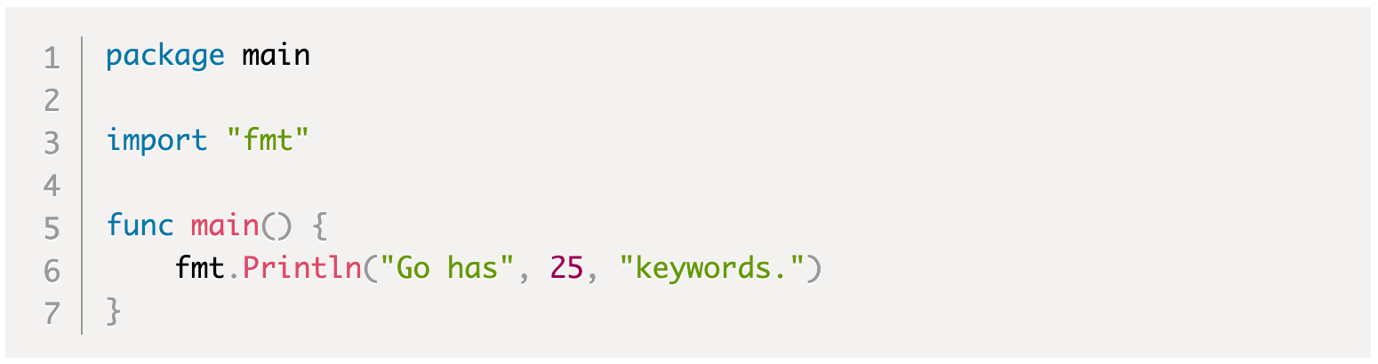 Третья строка импортирует fmt стандартный пакет с помощью import ключевого слова is. Идентификатор fmt — это имя пакета. Он также используется в качестве имени импорта и представляет этот стандартный пакет в объеме, содержащем исходный файл. В этом стандартном пакете объявлено много функций форматирования, которые можно использовать в других пакетах. Функция Println — одна из них. Он выведет строковые представления произвольного числа аргументов на стандартный вывод.