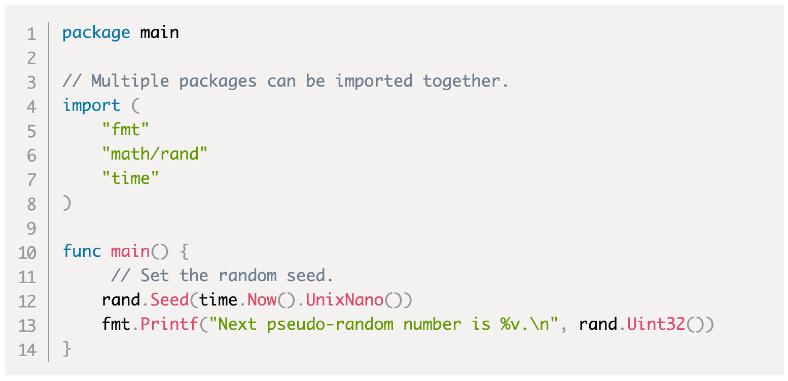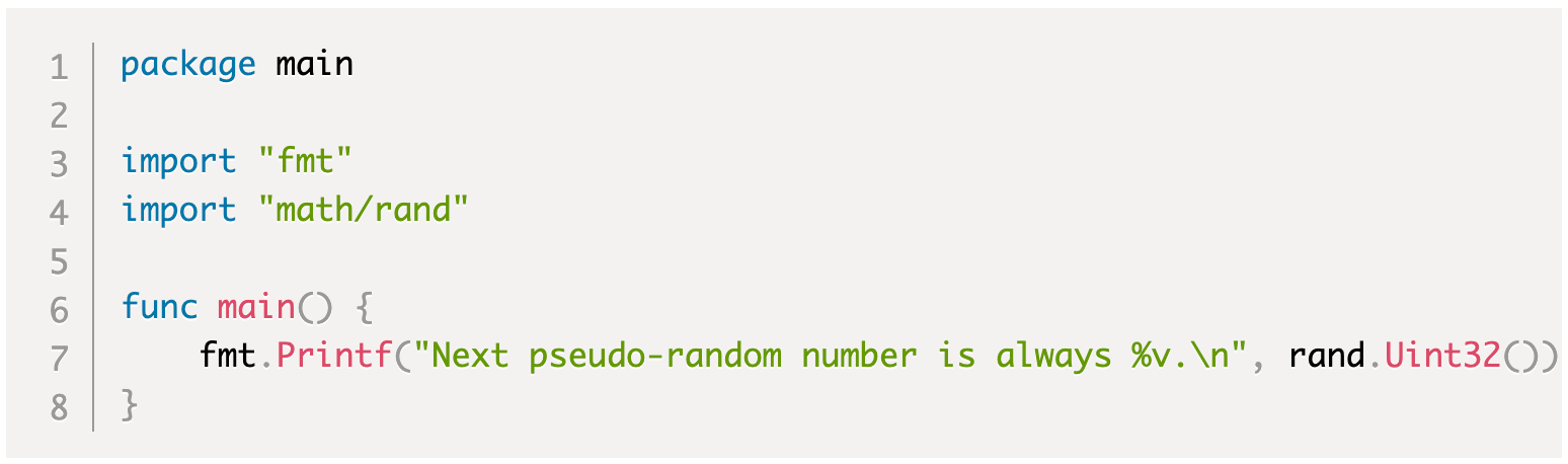 В этом примере имя пакета rand используется как имя импортируемого math/rand стандартного пакета. Вызов rand.Uint32() вернет случайное uint32 целое число.