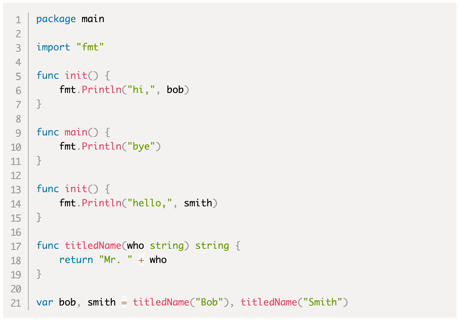 Обрати внимание, что в верхнем блоке уровня пакета init идентификатор может использоваться только в объявлениях функций. Мы не можем объявлять переменные/константы/типы на уровне пакета, имена которых init.