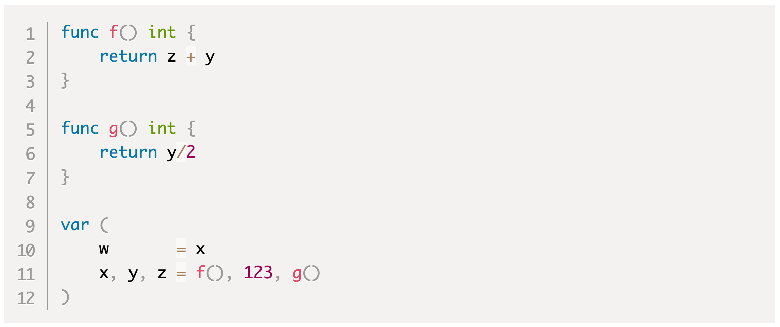 Среда выполнения Go попытается инициализировать переменные уровня пакета в пакете в соответствии с порядком их объявления, но переменная уровня пакета наверняка будет инициализирована после всех ее зависимых переменных. Например, в следующем фрагменте кода инициализация четырех переменных уровня пакета происходит в порядке y, z, x и w.