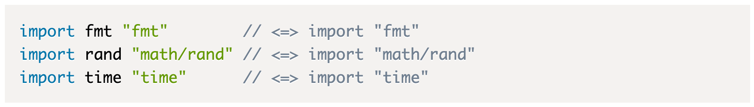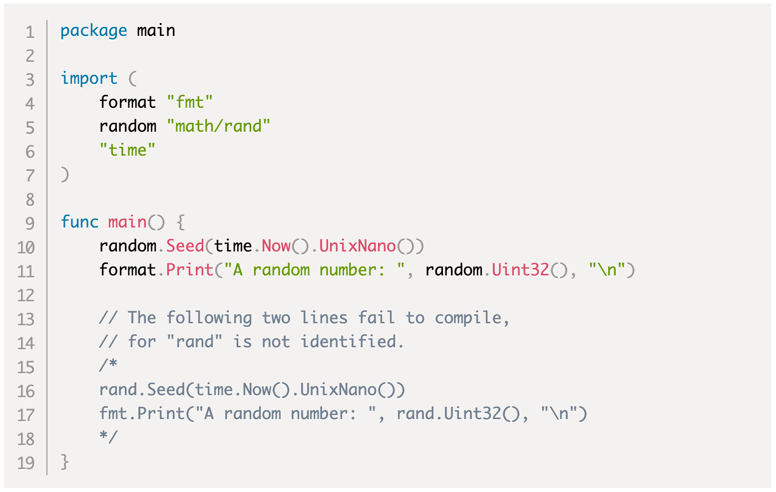 Мы должны использовать format и random в качестве маркера префикса в квалифицированных идентификаторах вместо реальных имен пакетов fmt и rand.