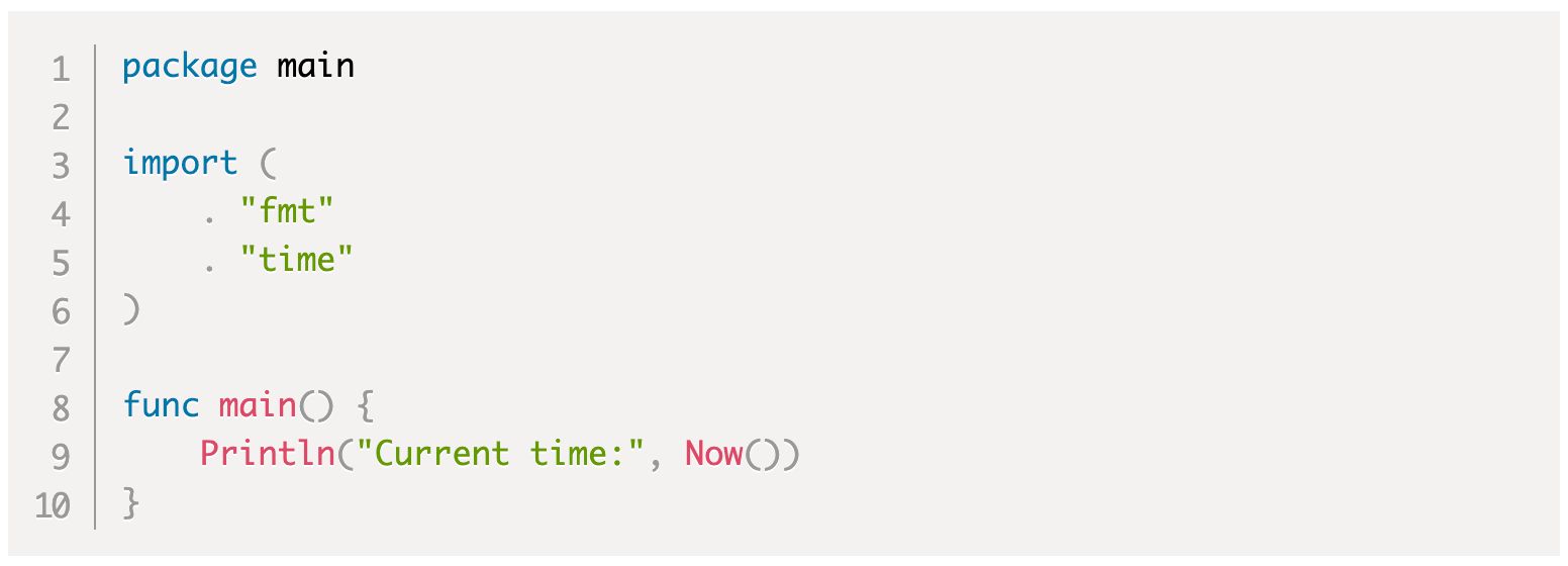 В приведенном выше примере необходимо использовать Println вместо fmt.Println, и Now вместо time.Now.