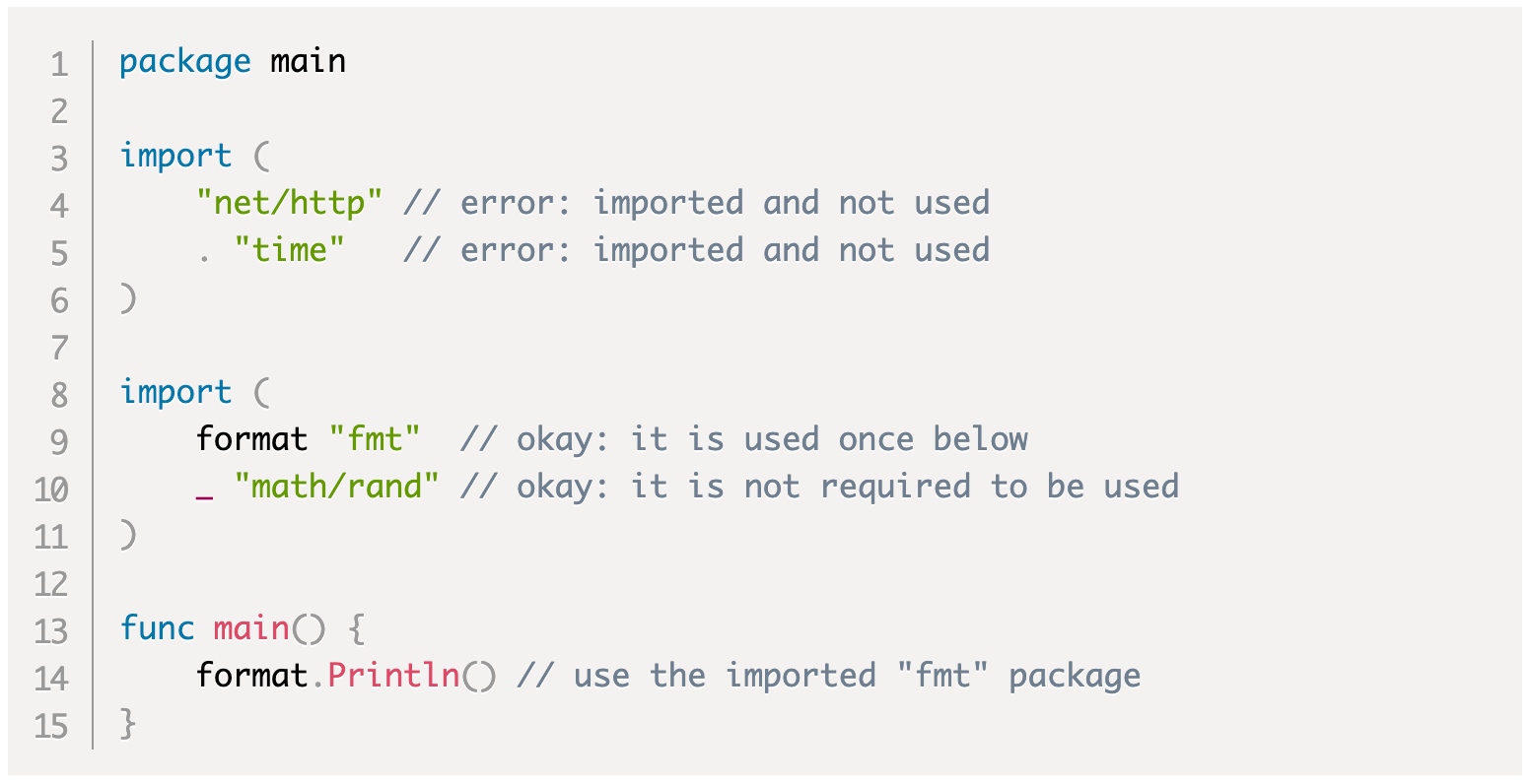 За исключением анонимного импорта, другие импорты должны использоваться хотя бы один раз. Например, следующий пример не компилируется.