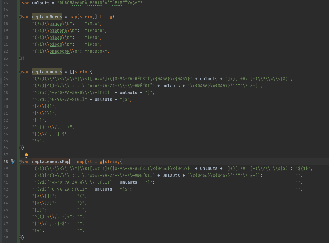 replacements — используется слайс паттернов regexp для соблюдения порядка очистки строки.
