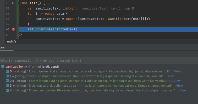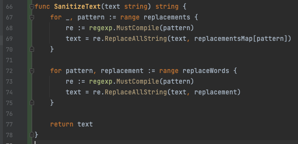 В большинстве случаев частой ошибкой программистов в Go даже в больших компаниях, где этого обычно не ожидаешь, является компиляция регулярных выражений во время проверки регулярок на каждый вызов функции. Очень часто встречается в сравнении эффективности языков, когда пишут бенчмарки на проверку регулярных выражений и допускают эту ошибку. Попробуем написать неэффективную функцию SanitizeText(text string) string, которая очищает спецсимволы по порядку в первом этапе и заменяет слова по словарю во втором.