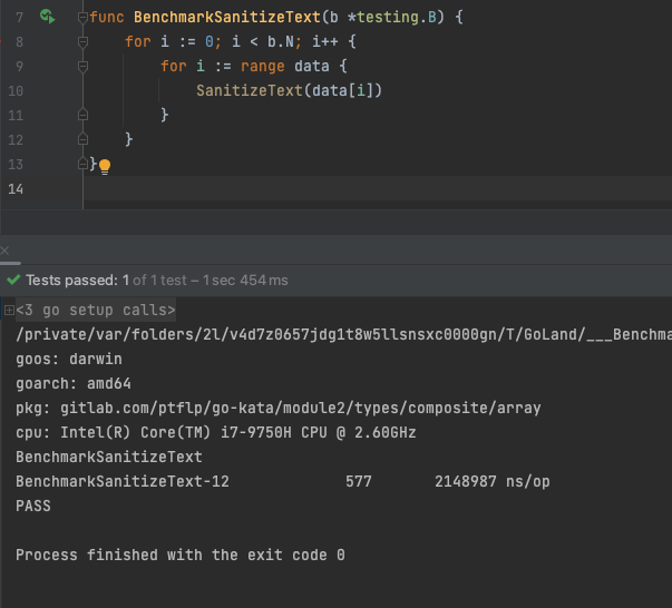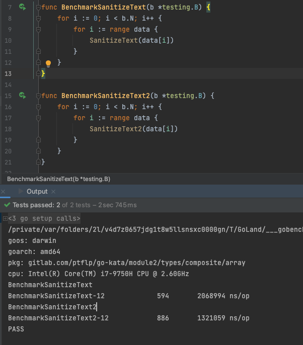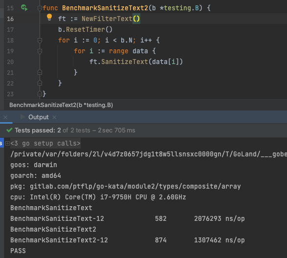 Как можно увидеть, на первую функцию у нас уходит 2068994 наносекунд на операцию и 1321059 во второй версии нашей функции очистки текста, что примерно в 1.5 раза быстрее.