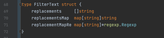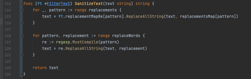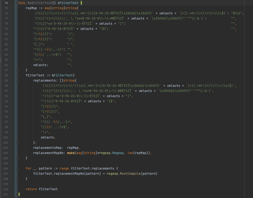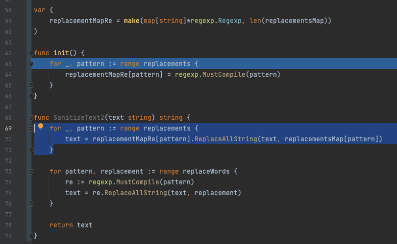 Мы добавили компиляцию regex на этап инициализации приложения, изменили первый цикл замены текста (выделено синим цветом). Результат компиляции регулярок мы храним в глобальной переменной replacementMapRe на уровне пакета.