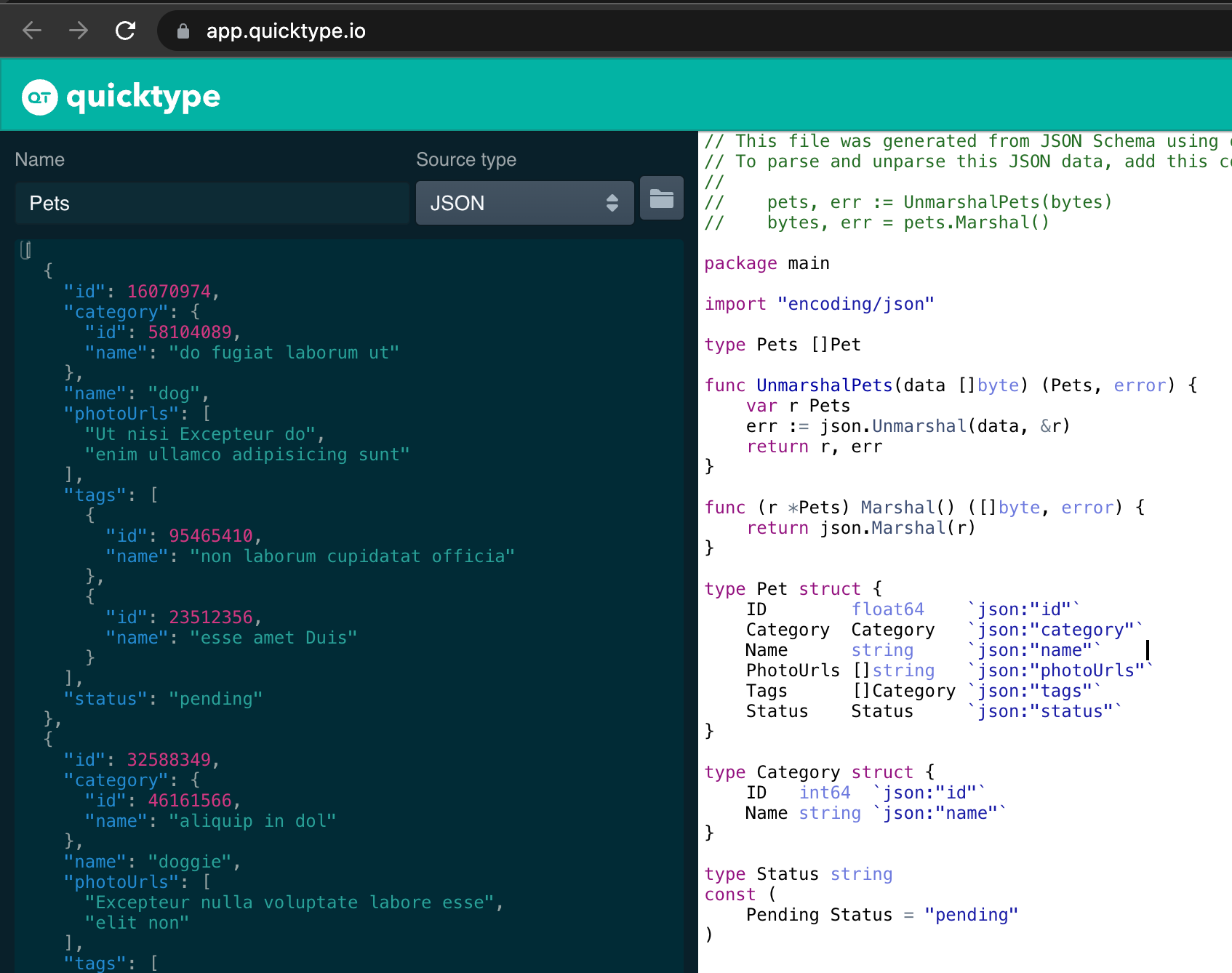 - Сгенерируем код автоматически, воспользовавшись сервисом quicktype:.