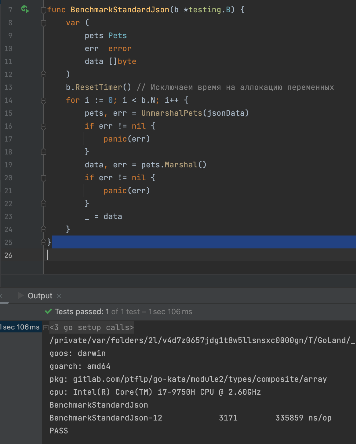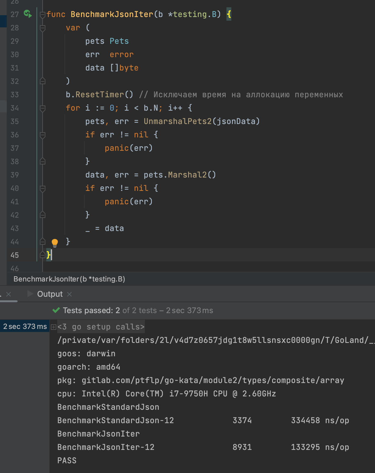 Как мы видим, версия с jsoniter практически в три раза быстре: Jsoniter потребляет 133295 ns/op против 334458 ns/op в стандартной библиотеке.