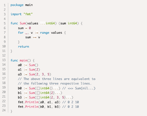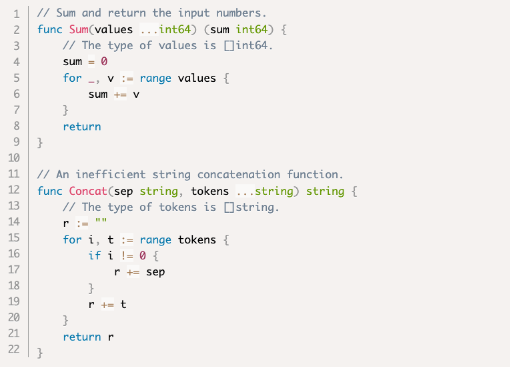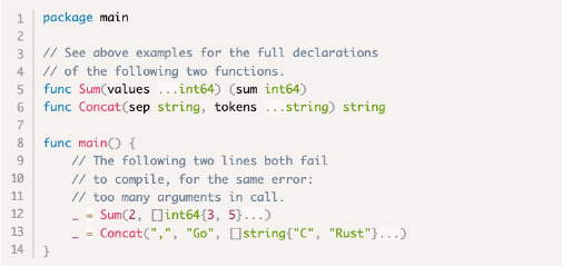 Объявления переменных функций аналогичны общим объявлениям функций. Разница в том, что последний параметр функции с переменным числом аргументов должен быть параметром с переменным числом аргументов. Обрати внимание, что параметр с переменным числом аргументов функции будет рассматриваться как срез в теле функции с переменным числом аргументов.