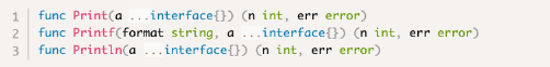 Все функции Print, Println и Printf в стандартном пакете fmt являются функциями с переменным числом аргументов.